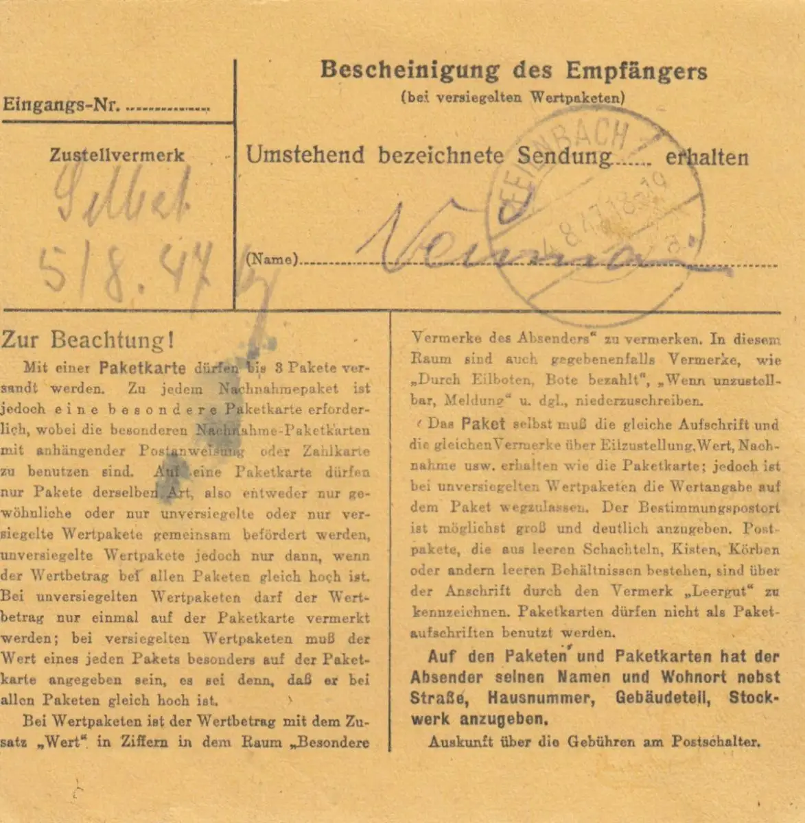 Carte de paquet 1947: Landshut vers Feilnbach Obb.