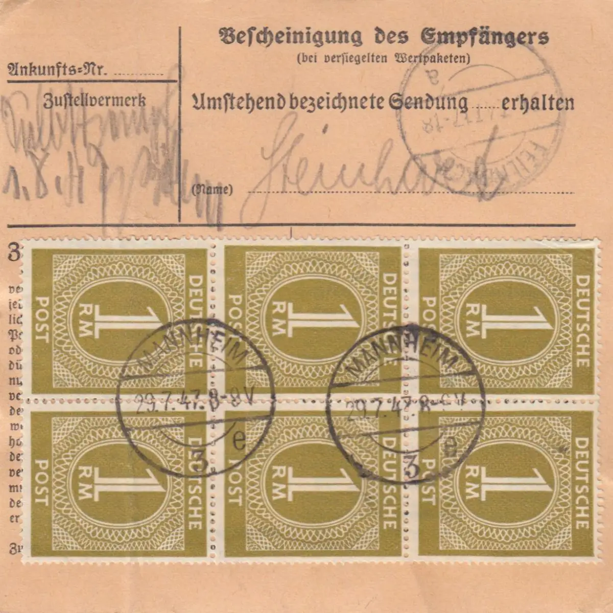 Carte de paquet 1947: Mannheim vers Feilnbach, Urgent