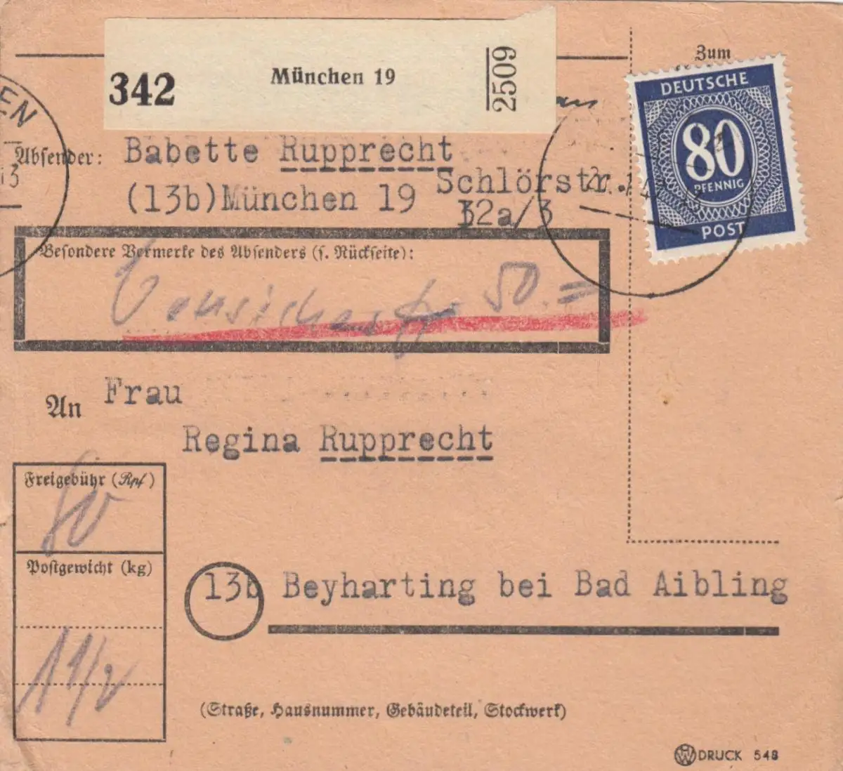 Carte de paquet 1947: Munich vers Beyharting, assuré