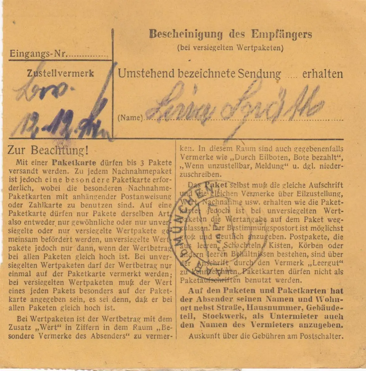 Carte de paquet 1947: Walldorf par Haar, Auto-booker
