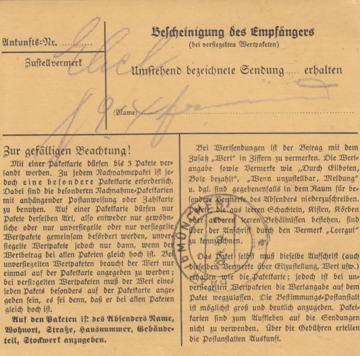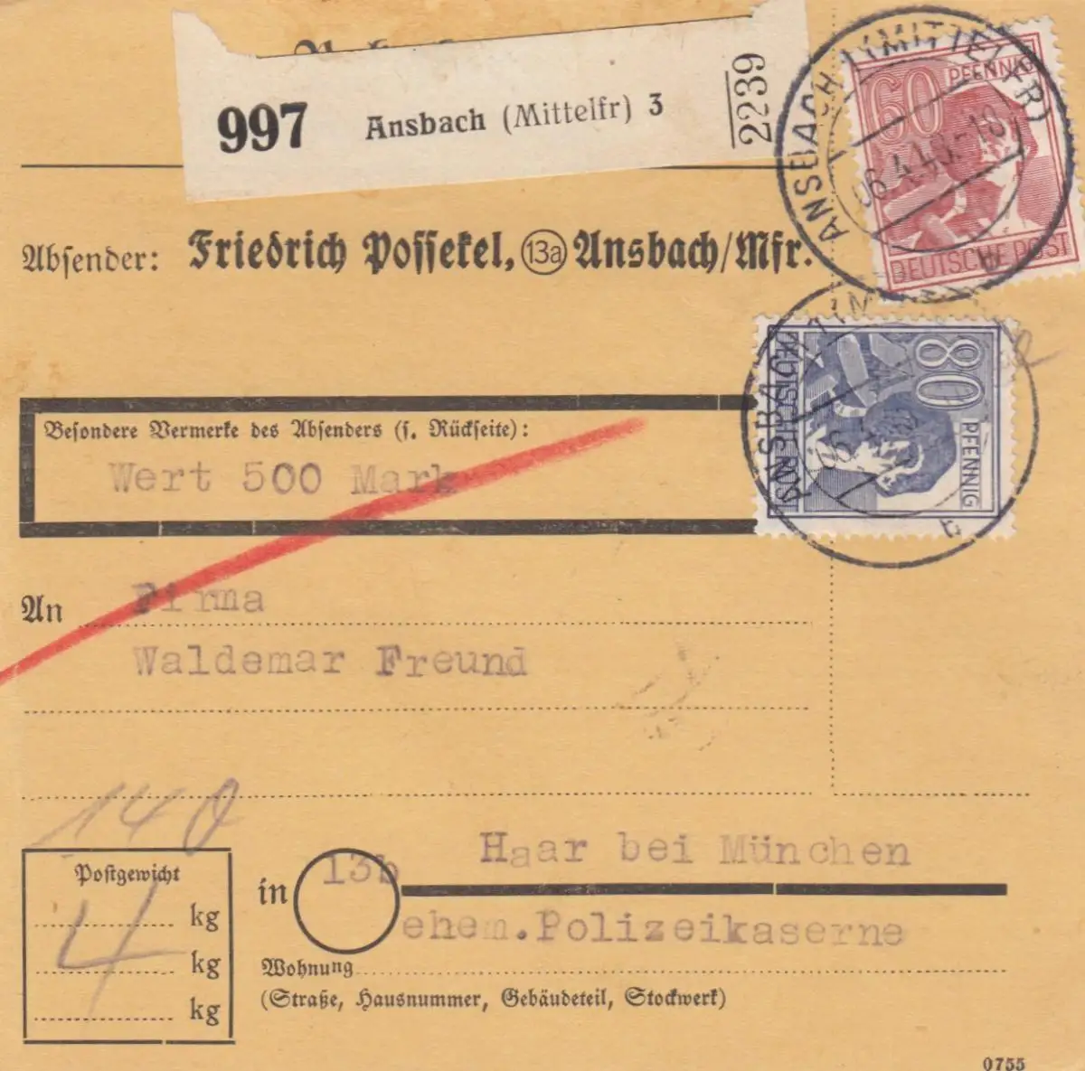 Carte de paquet 1948: Ansbach par Haar, carte de valeur, auto-bookeur