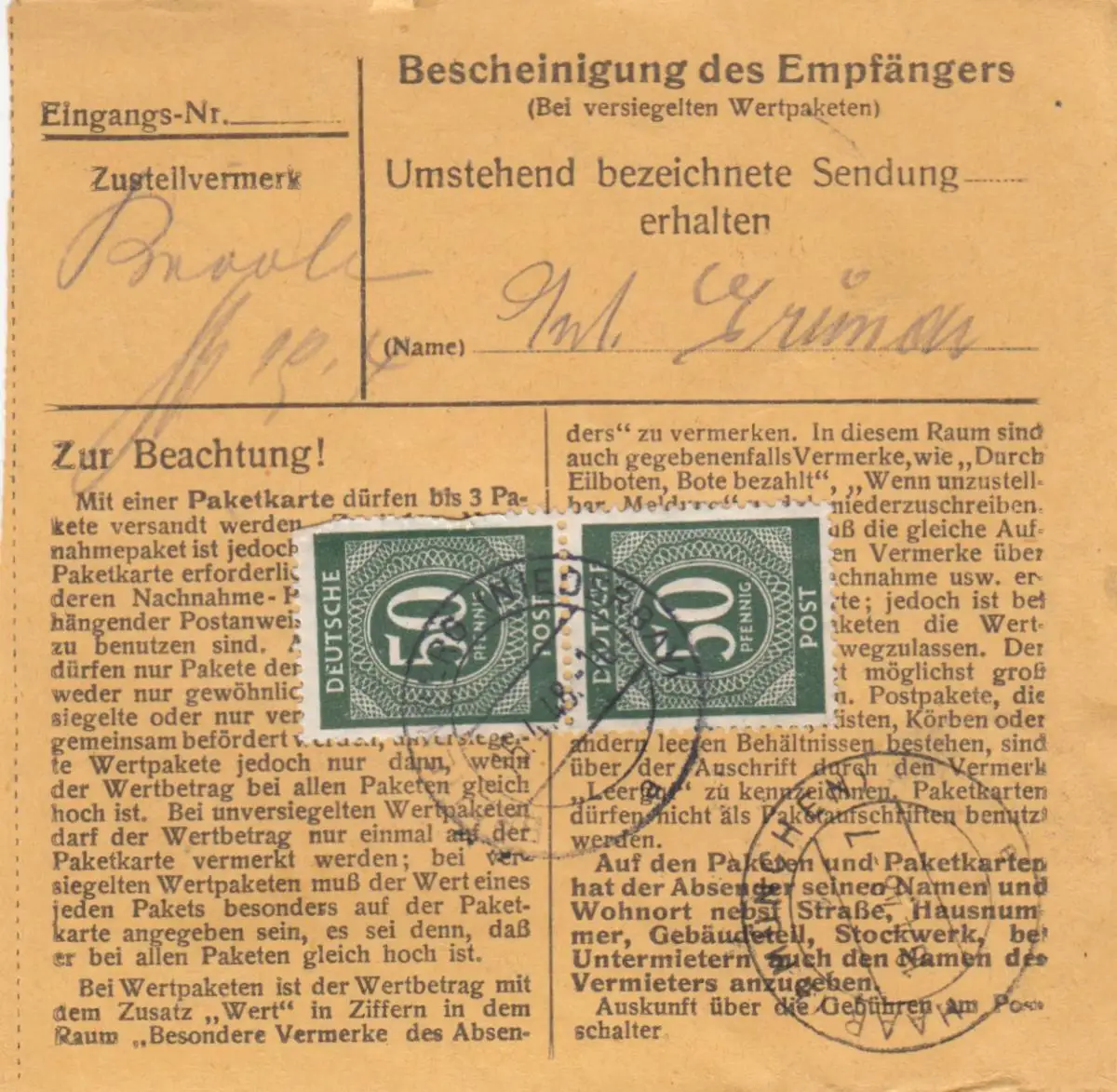 Carte de paquet 1948: Breitenberg b. Passau après les cheveux 77