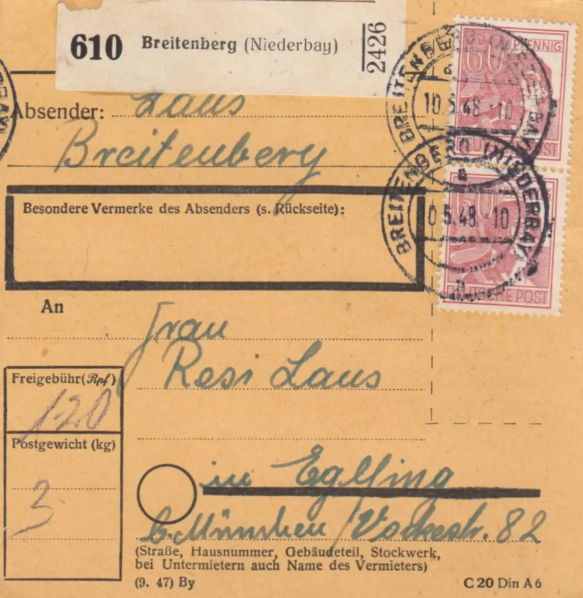 Carte de paquet 1948: Breitenberg vers Eglfing