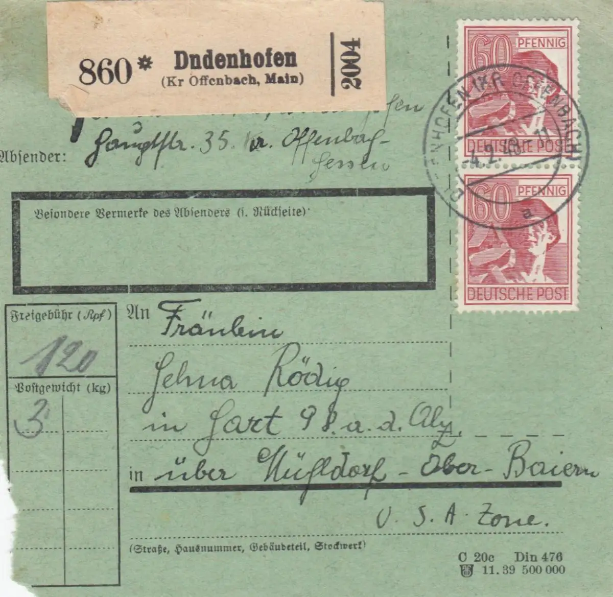 Carte de paquet 1948: Dudenhofen n. Hart, fausse impression autocollant, bes. Forme.