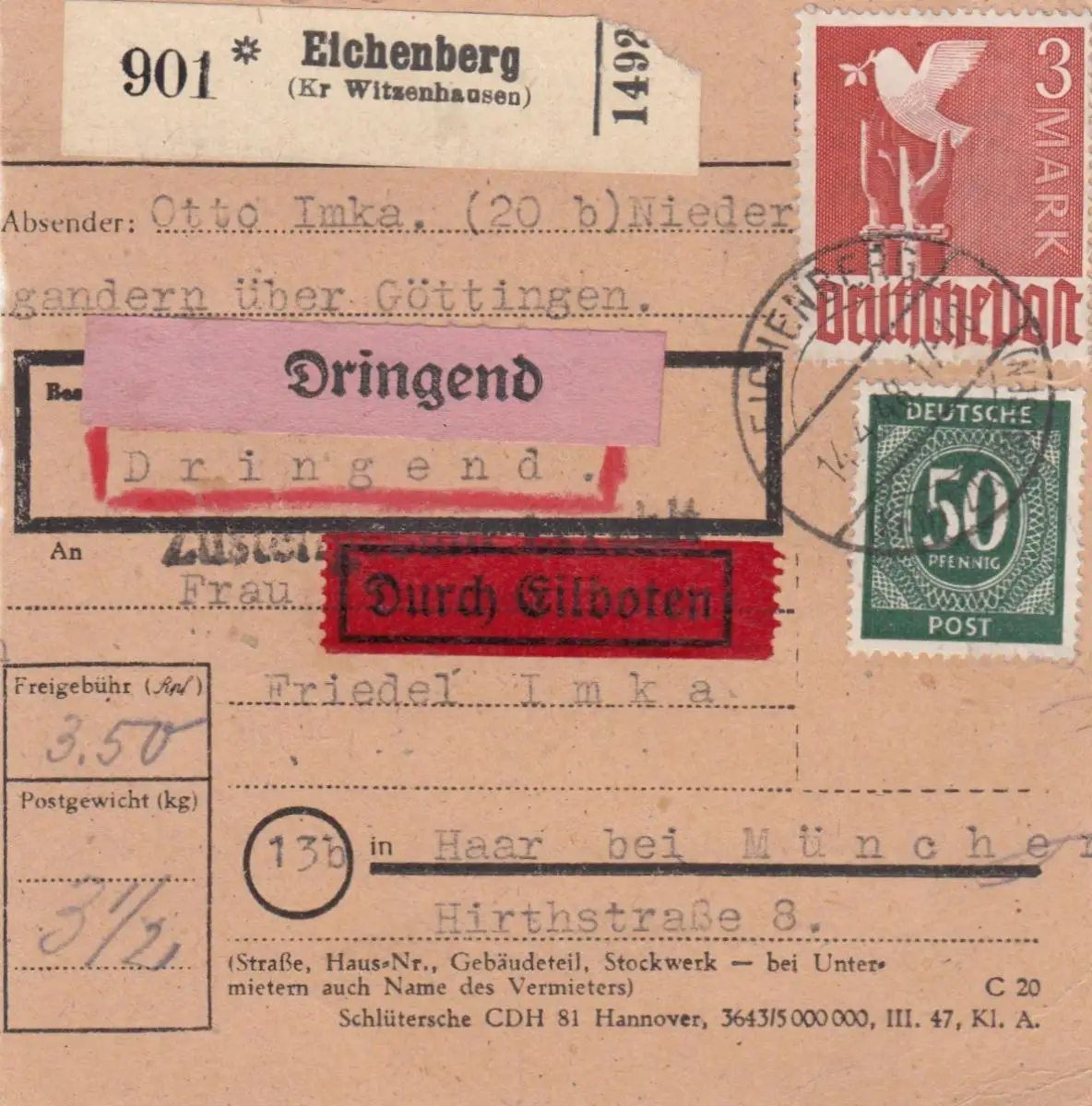 Carte de paquet 1948: Eichenberg après Haar, Urgent, Par les eilbots