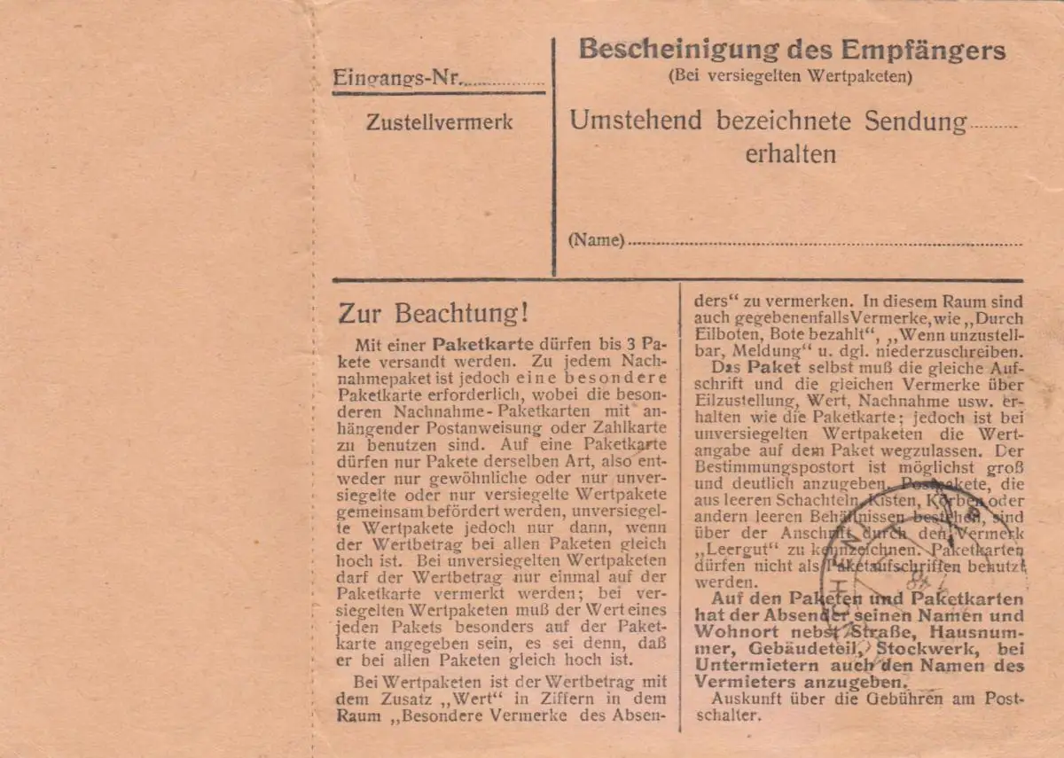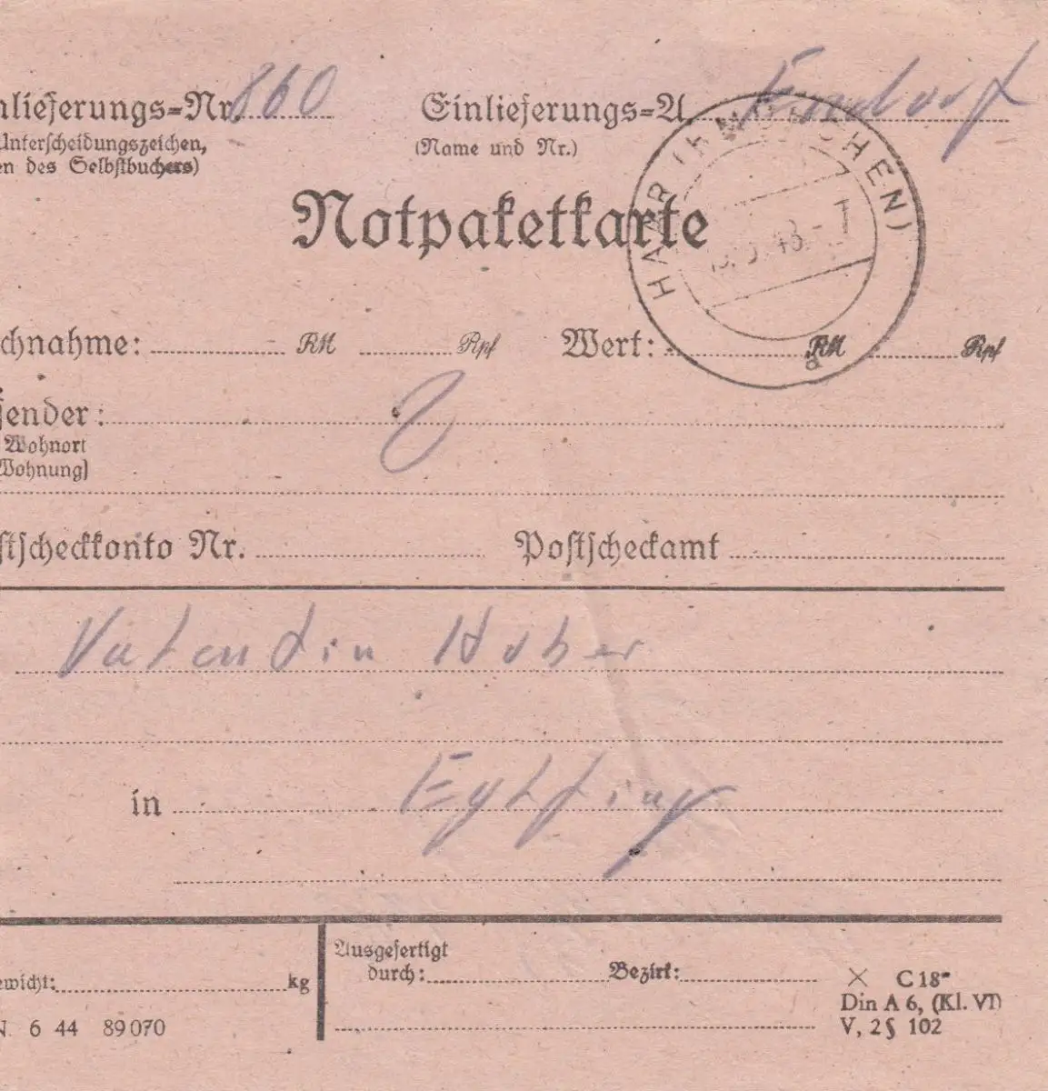 Carte de paquet 1948: Endorf vers Eglfing, avec carte de colis d'urgence