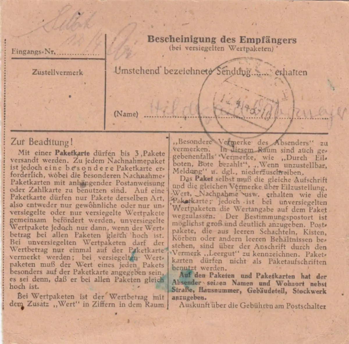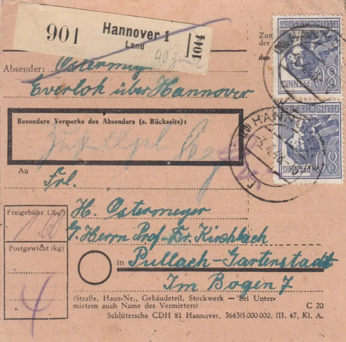 Carte de paquet 1948: Everloh vers Pullach-Gartenstadt via Hanovre