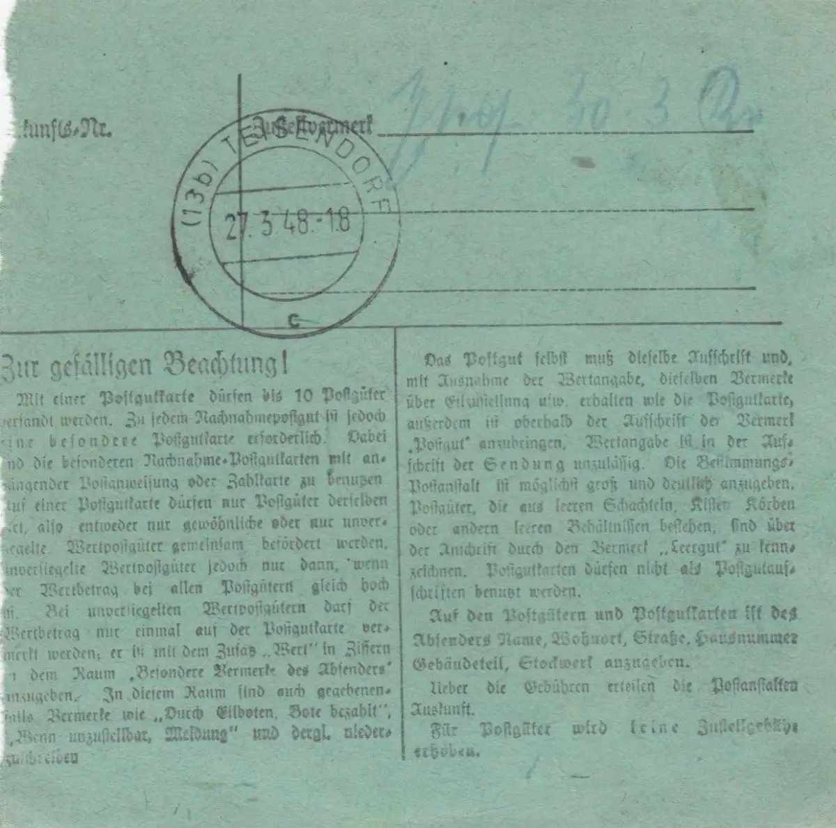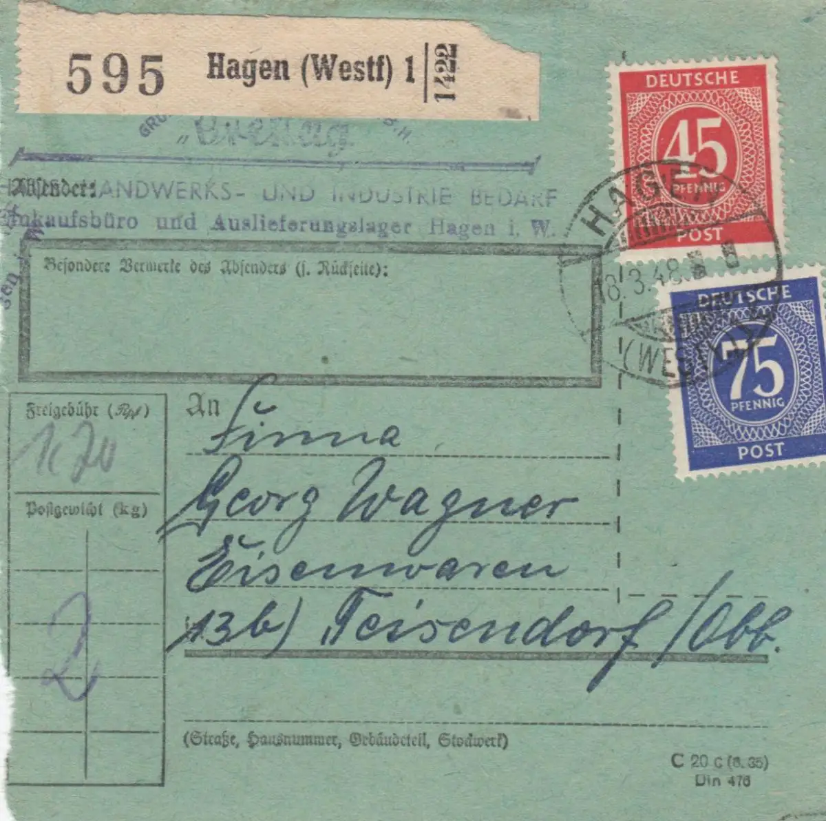 Carte de paquet 1948: Hagen vers Teisendorf, Fererie, formulaire spécial