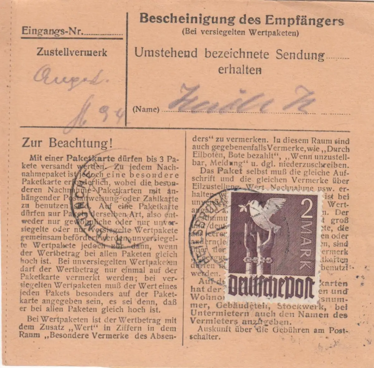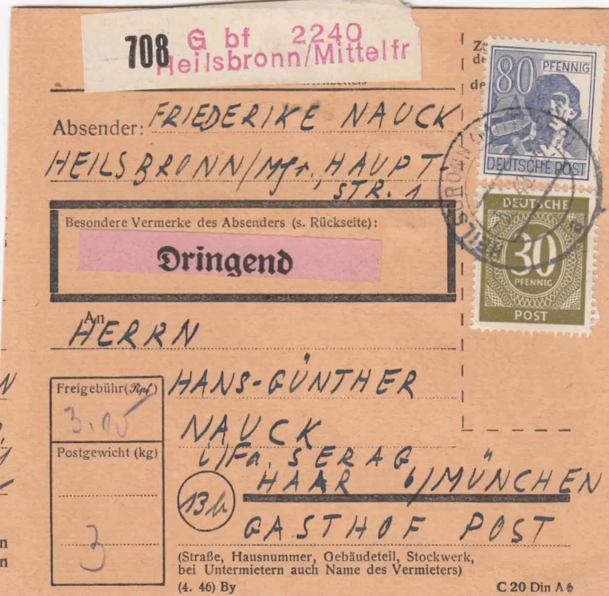 Carte de paquet 1948: Heilsbronn Moyen fr. par cheveux, urgent