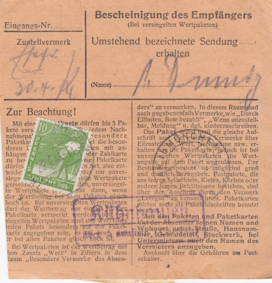 Carte de paquet 1948: Kirchstein Traunstein après Haar près de Munich