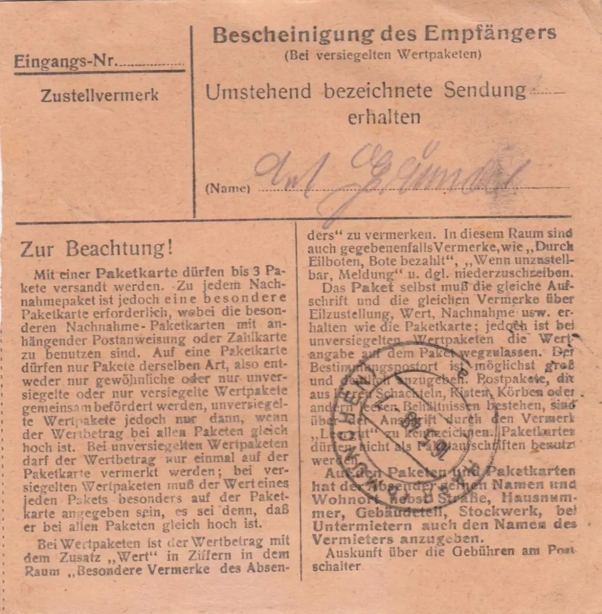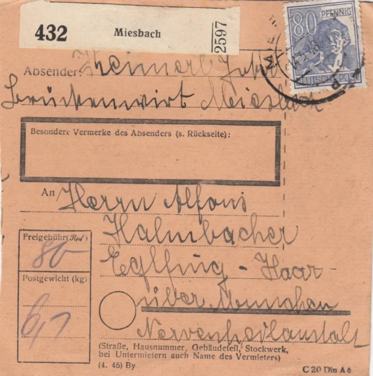 Carte de paquet 1948: Miesbach vers Eglfing, Nerveilstatl