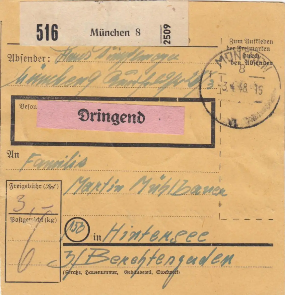 Carte forfait 1948: Munich vers Hintersee, Urgent