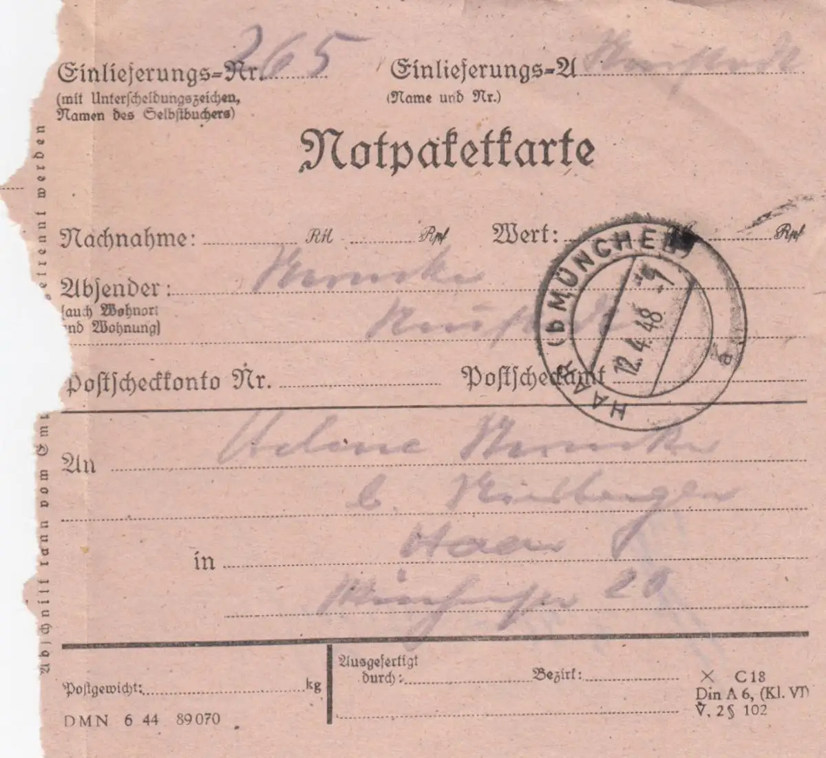 Carte de paquet 1948: Carte d'urgence pour Haar Munich