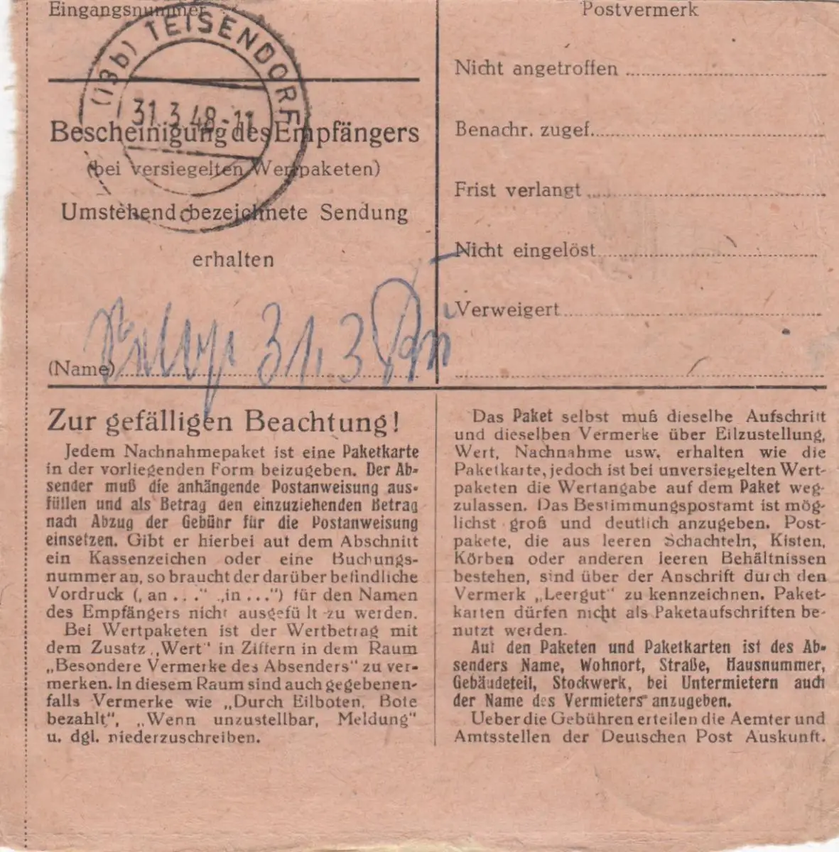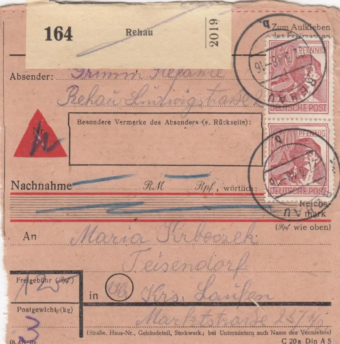 Carte de paquet 1948: Rehau vers Teisendorf, réduction
