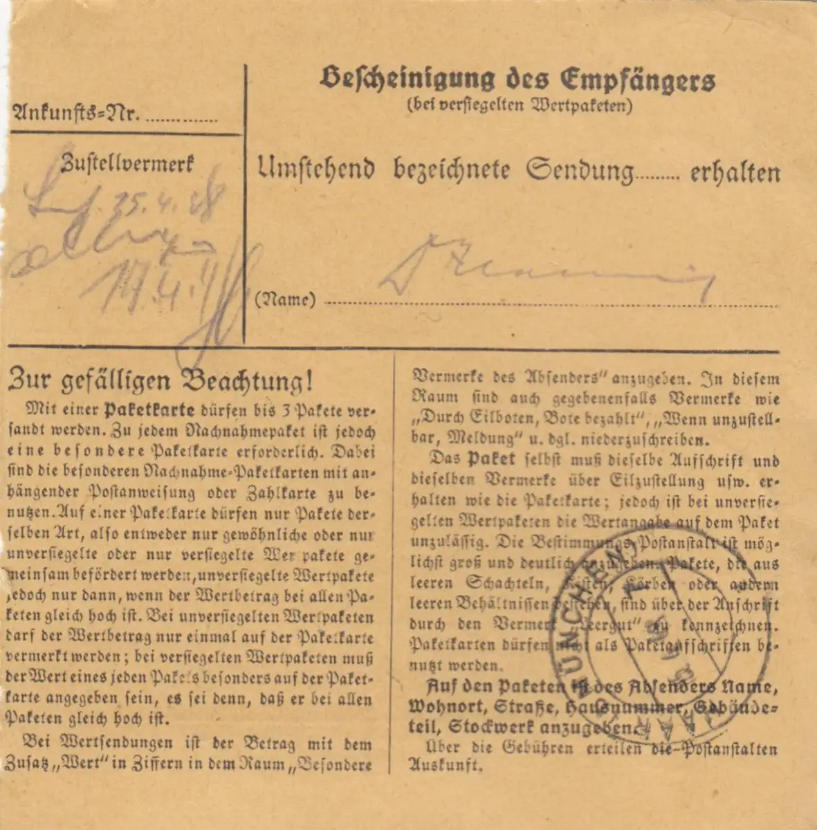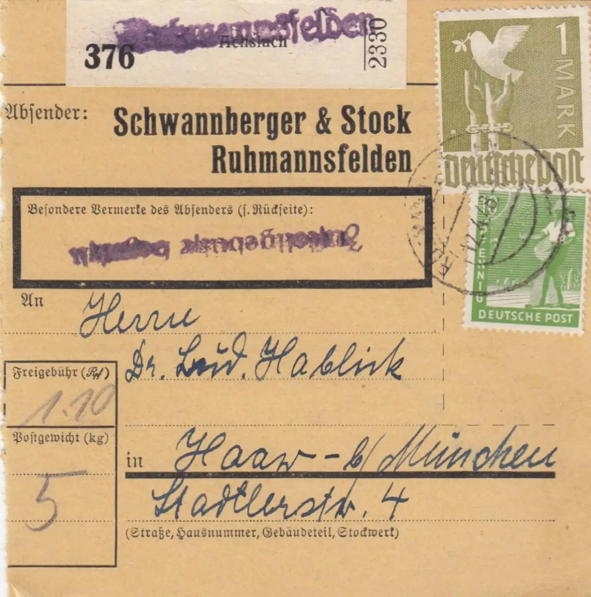 Carte de paquet 1948: Ruhmannsfelden Achslach par cheveux, Auto-bookeur