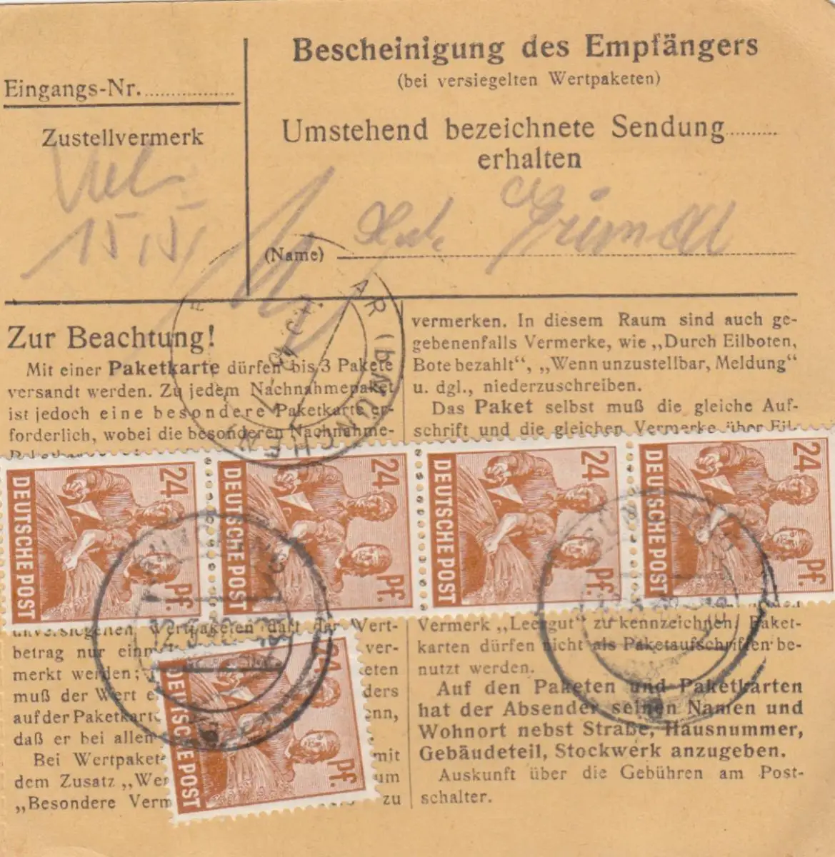 Carte de paquet 1948: Sunching après Eglfing, Carte