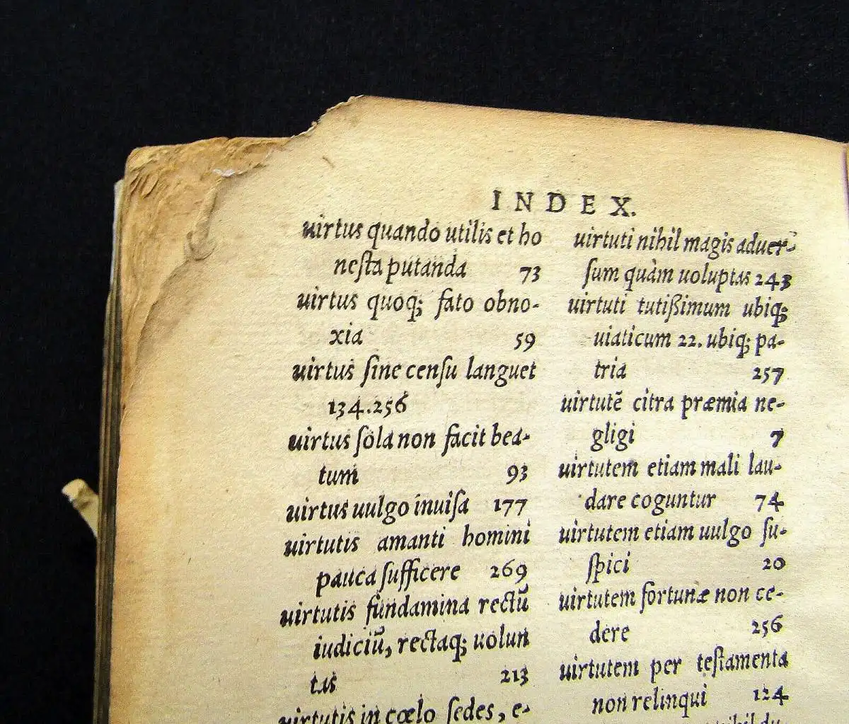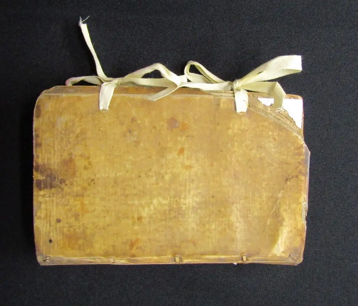 Einband stärker berieben, bestoßen und angeschmutzt, hinterer Deckel mit Fehlstelle an oberer Ecke, rotes hs. Rs., Bindebänder erneuert. Vorsatz, Titel und erste 2 Bll. in oberer Ecke restauriert ohne Textberührung, Titel mit hs. Notizen, Papier altersbedingt gebräunt sowie braun- und im Rand feuchtfleckig. Letzte Blatt mit fehlender oberer Ecke ohne Textberührung