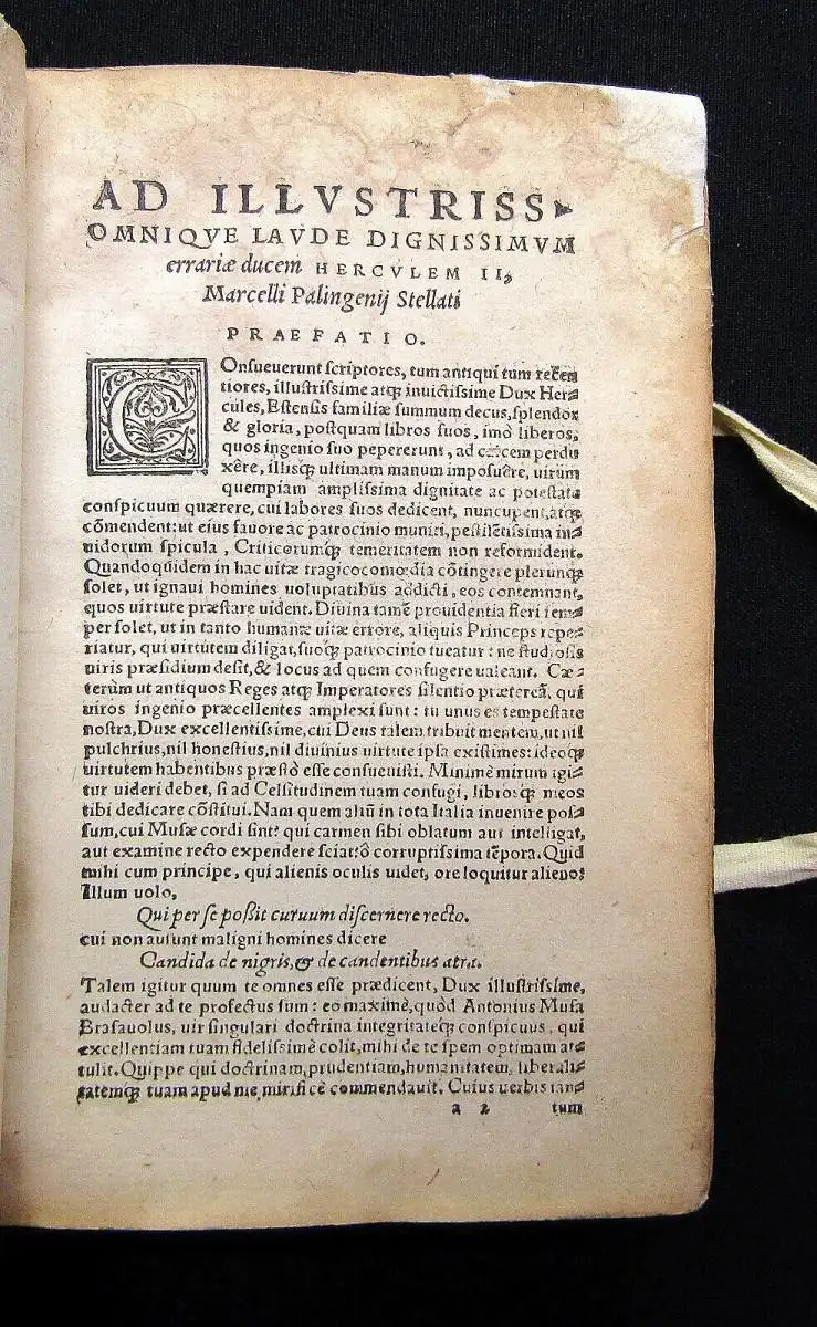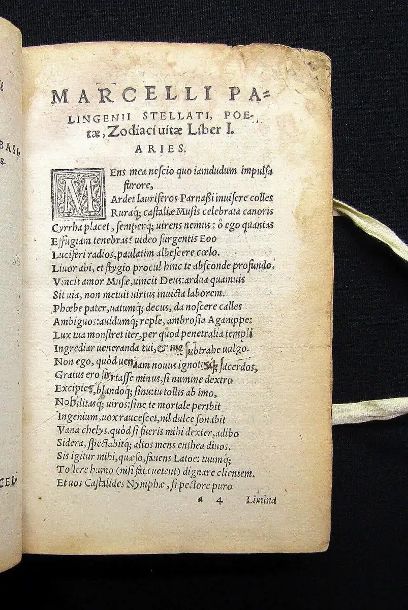 Frühe Ausgabe des mehrfach aufgelegten Lehrgedichtes. Es wurde erstmalig 1531 in Venedig veröffentlicht und enthält 12 Gedichte über die Tierkreiszeichen. Es vereint eine Vielzahl philosophischer und naturwissenschaftlicher Themen und greift in satirisch-philosophischer Form Papst und Klerus an. 1559 setzte Papst Paul IV. den 'Zodiacus vitae' auf den Index.