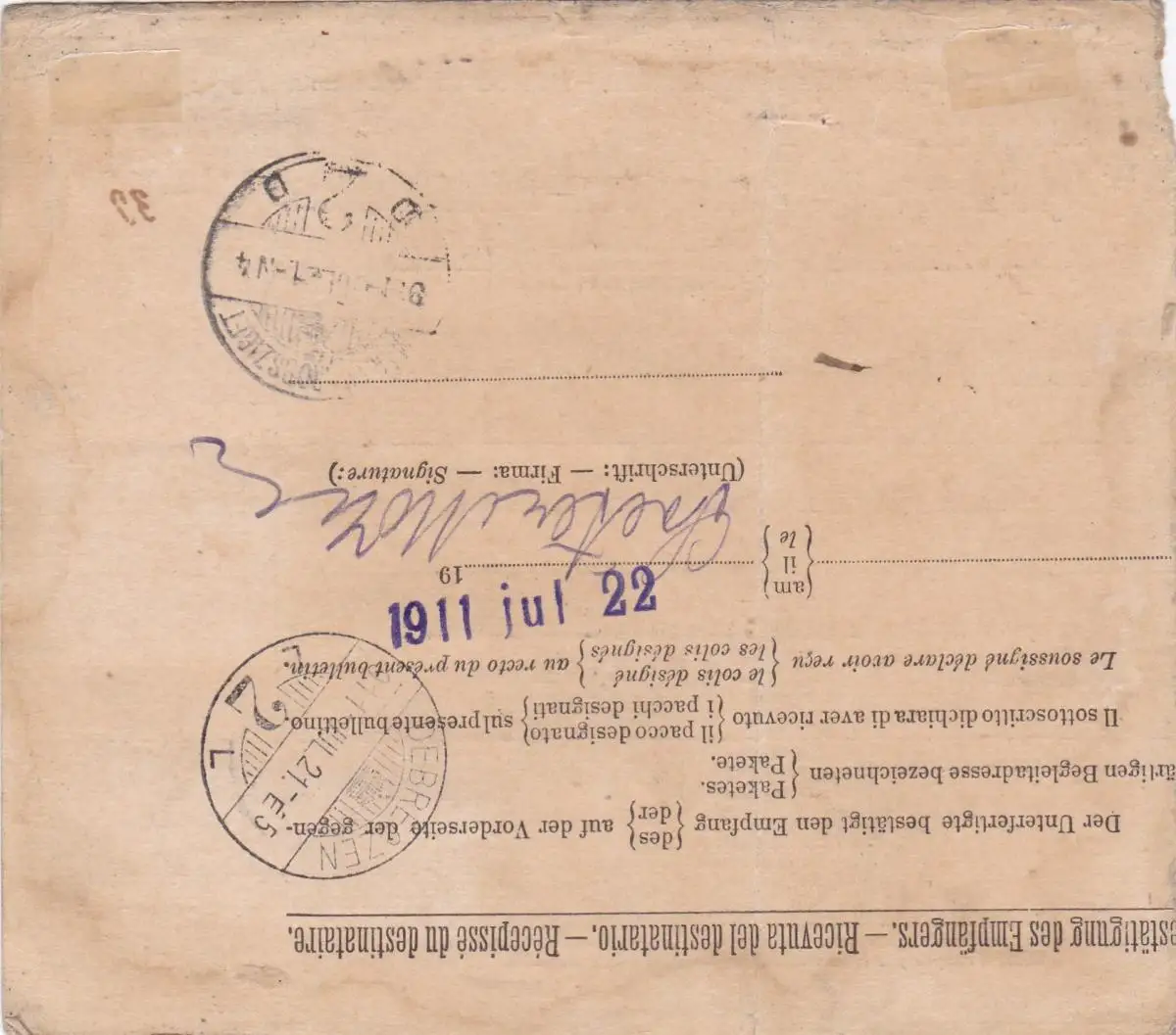 Parcel card Jérusalem (Levante) 1911 to Hungary