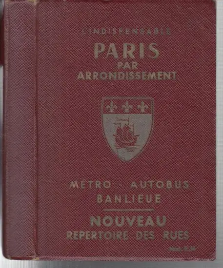 14 x 9,5 cm. Reliure pleine avec les armoiries de Paris sur la couverture. 160 pages avec un plan Métro en couleurs, le répertoire des rues et renseignements pratiques, 94 pages avec tracés détaillés des lignes d'autobus Paris-Banlieue, adresses utiles et 20 double-plans en couleurs des 20 arrondissements avec les adresses de la polices, des pompiers, des églises, bureaux de poste et des marchés. En annexe un plan de Paris avec indication du Métropolitain, sur le verso un plan de la banlieue de Paris échelle 1:70.000, tous les deux en couleurs. La couverture avec petites traces d'usage. Inscription d'adresse d'un ancien propriétaire au stylo à bille sur le bord de la couverture intérieure avant, également une page de texte avec une courte note marginale. En bon état