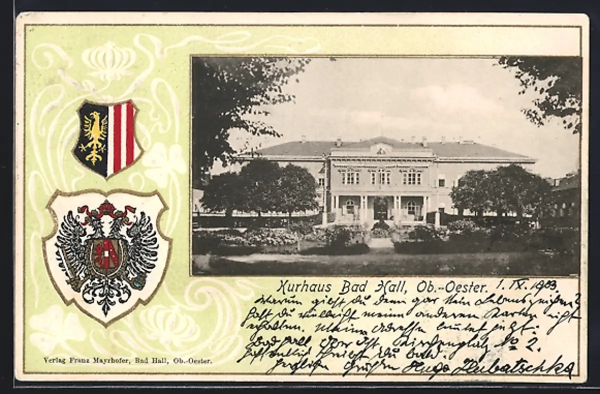 Passepartout-Lithographie Bad Hall, Kurhaus von der Anlage aus, Wappen