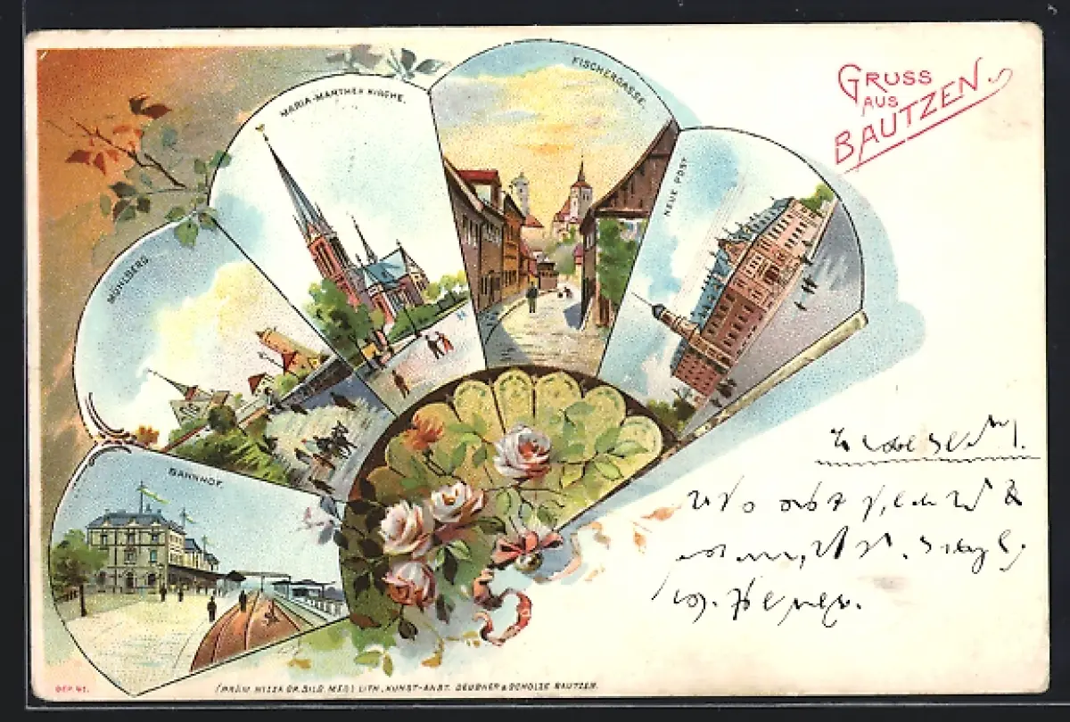 Passepartout-Lithographie Bautzen, Maria-Marthen-Kirche, Fischergasse, Bahnhof im Fächer