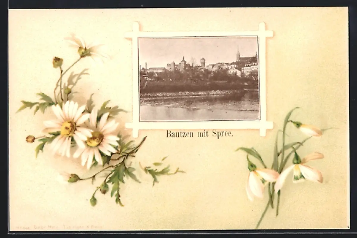 Passepartout-Lithographie Bautzen, Stadtansicht mit Spree, Schneeglöckchen, Kamille