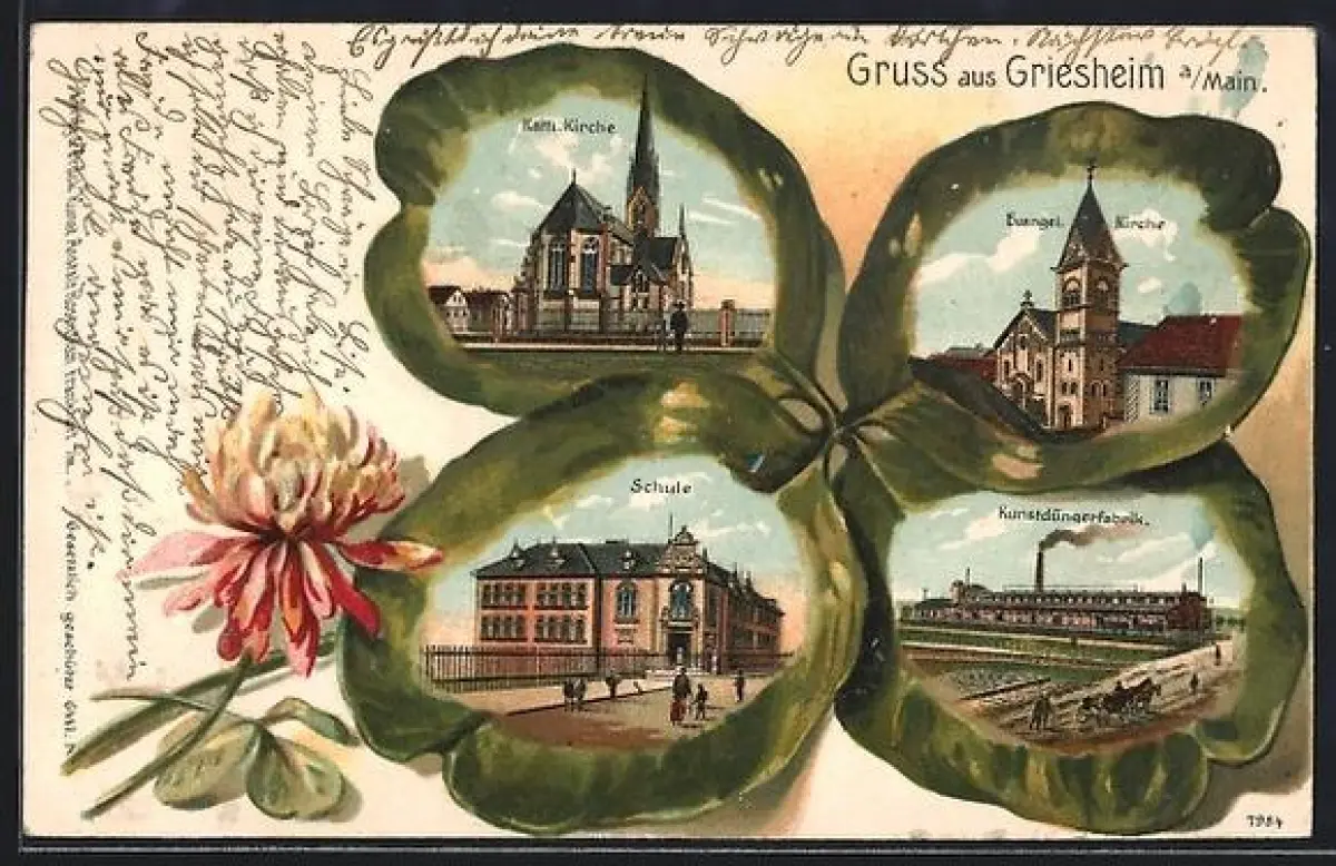 Passepartout-Lithographie Griesheim a. Main, Kath. Kirche, evang. Kirche, Schule, Kunstdüngerfabrik