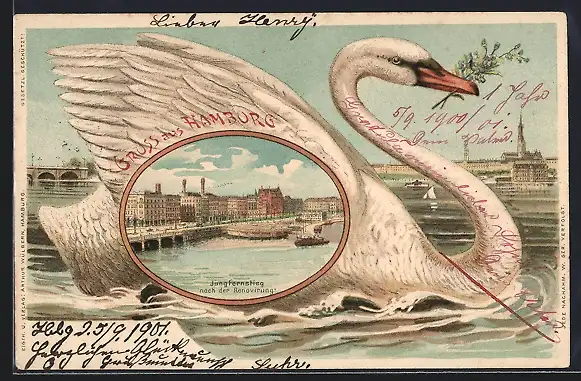 Passepartout-Lithographie Hamburg, Jungfernsteig nach der Renovierung, Rahmen mit Schwan