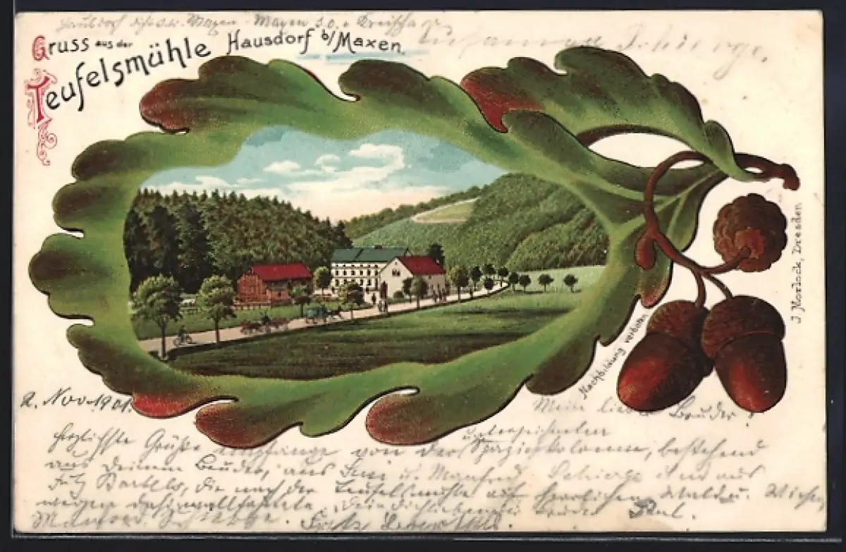 Passepartout-Lithographie Hausdorf b. Maxen, Teufelsmühle, Eichenblatt