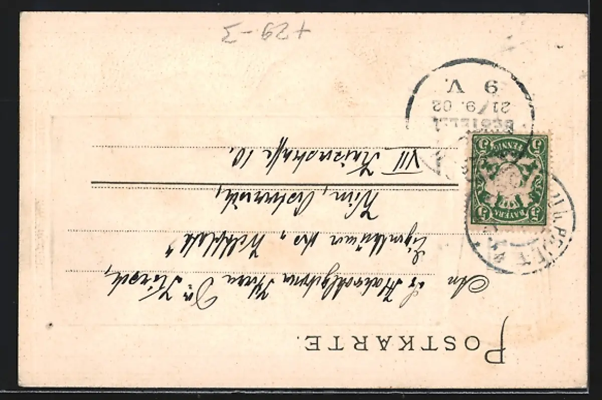 Personenbezogene Daten auf der Rückseite der Karte wurden durch blauen Textmarker unkenntlich gemacht. Die blauen Stellen sind auf die Vorderseite durchgeweicht und wirken sich negativ auf das Postkartenfoto aus