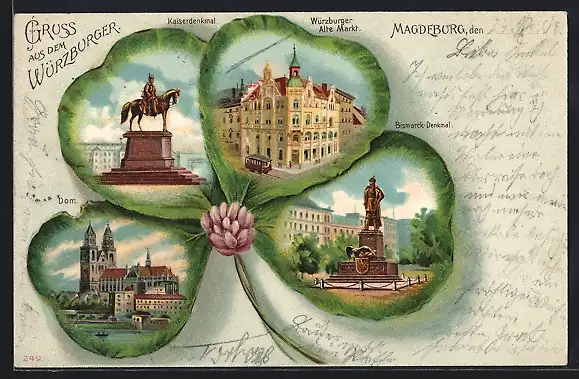 Passepartout-Lithographie Magdeburg, Kaiserdenkmal, Bismarck-Denkmal, Dom, Würzburger Alte Markt, Kleeblattrahmen