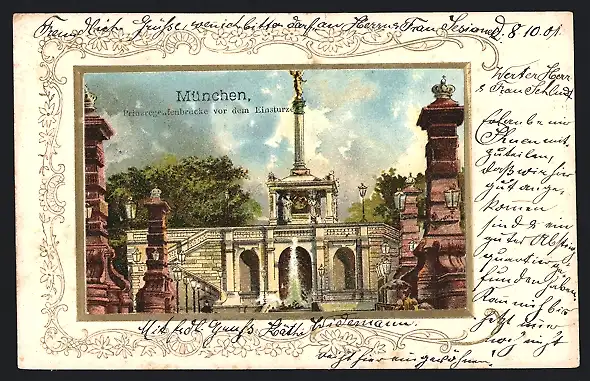 Passepartout-Lithographie München, Prinzregentenbrücke mit Friedensdenkmal vor dem Einsturz