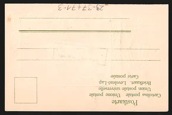 Personenbezogene Daten auf der Rückseite der Karte wurden durch blauen Textmarker unkenntlich gemacht. Die blauen Stellen sind auf die Vorderseite durchgeweicht und wirken sich negativ auf das Postkartenfoto aus