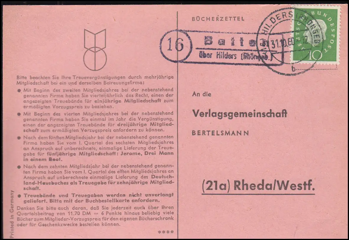 Pays-Bas: Batten, via HILDERS (RHÖNGEB.) 31.10.1960, carte postale vers Rheda