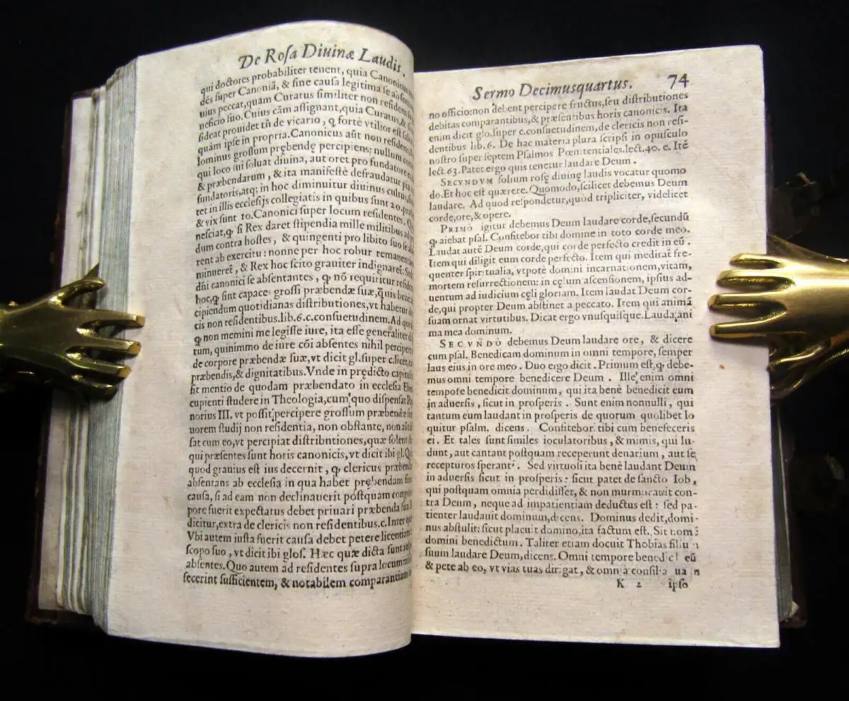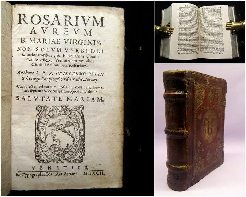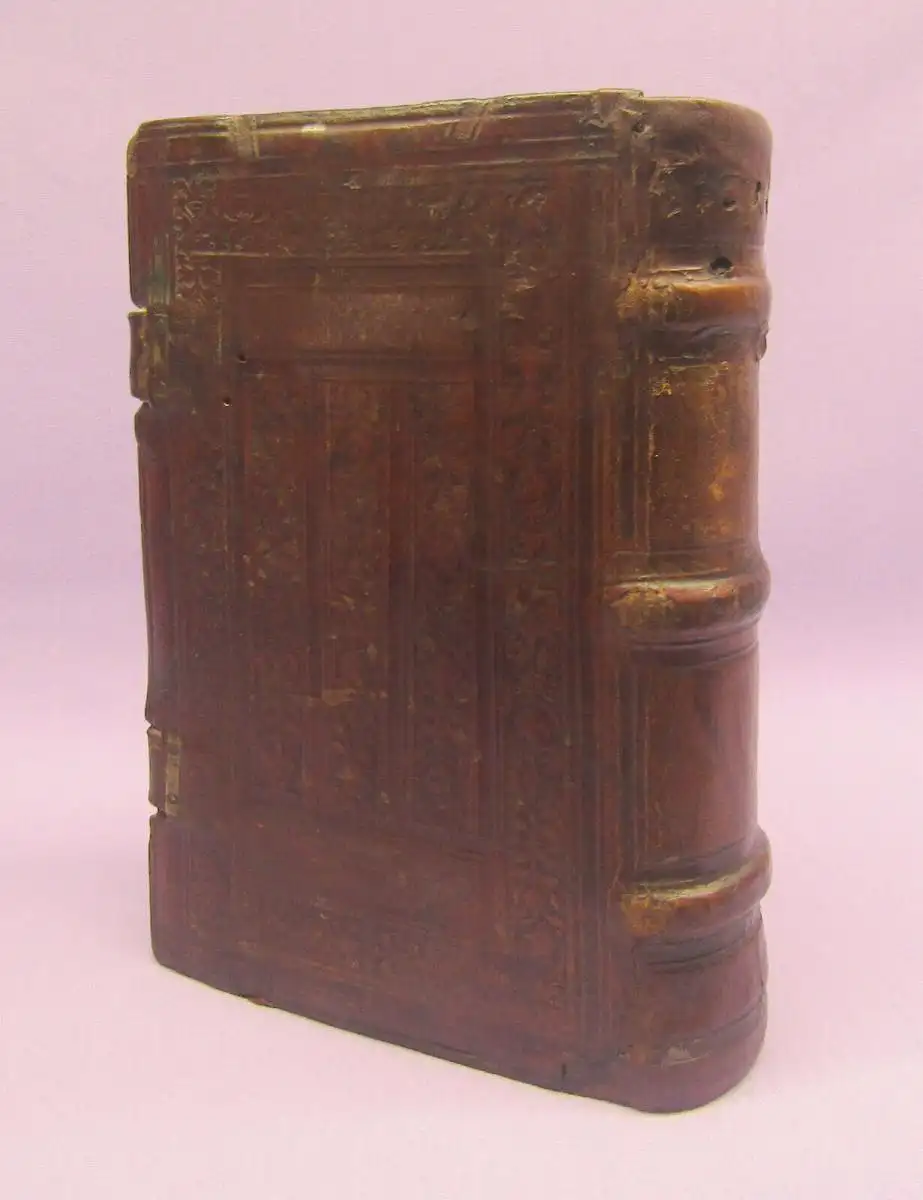 Titelvignette, 8 Bll., 407 S., 2nn.S., Leidereinband d. Zt. über Holz mit 3 Bünden und 2 Schließen, mit reicher Blindprägung, auf Deckel mit üppiger Goldprägung