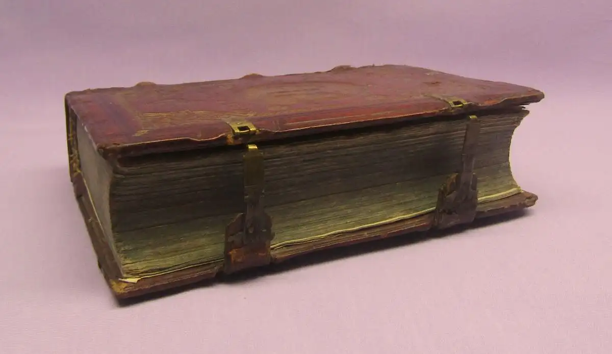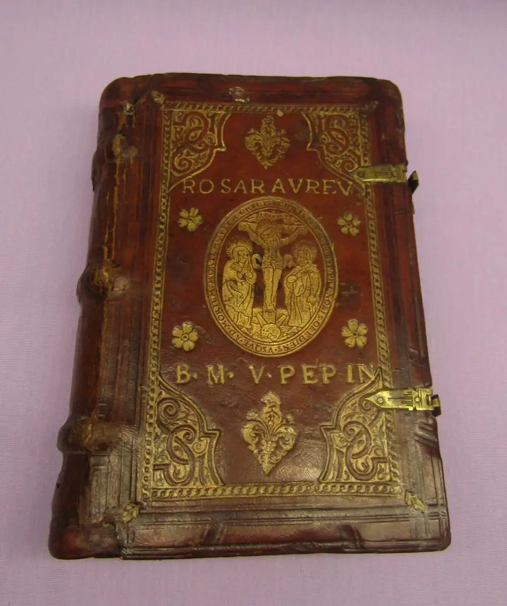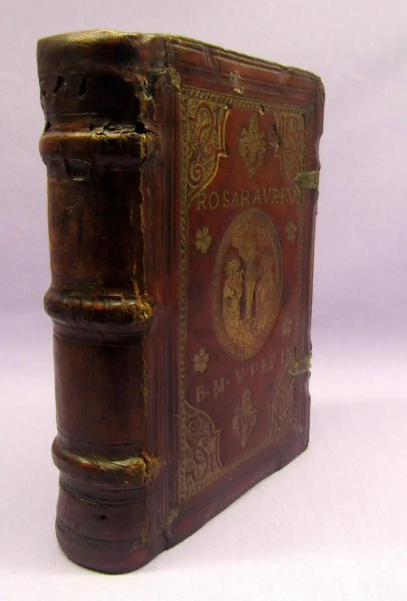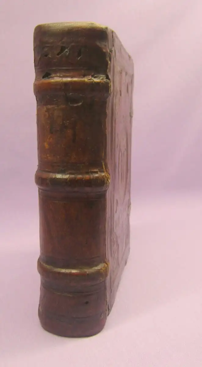 Einband berieben und bestoßen, Kapitale restauriert, wurmspurig, Prägung im Deckel zeigt die Kreuzigung Christi, beide Schließen intakt, Papier altersbedingt gebräunt, teils braun-und fingerfleckig