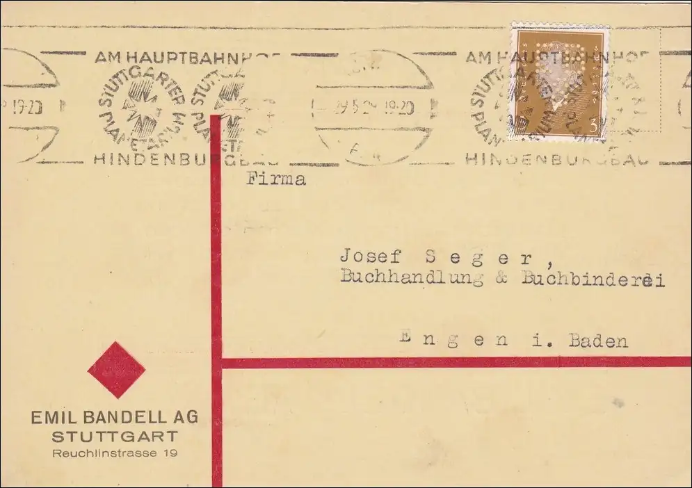 Perfin: Lettre de Stuttgart, Hindenburgbau Stamp publicitaire, Emil Bandell AG, EB