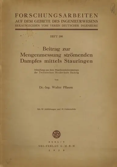 Pflaum, Walter: Beitrag zur Mengenmessung strömenden Dampfes mittels Stauringen. Mitteilung aus dem Maschinenlaboratorium der Technischen Hochschule Danzig. Mit 59 Abbildungen und 19 Zahlentafeln. [= Forschungsarbeiten auf dem Gebiete des Ingenieurwesens