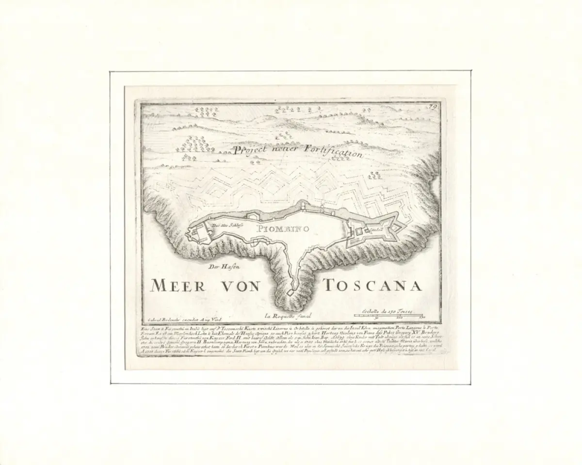 Piombino. Befestigungsplan aus der Vogelschau. Original-Kupferstich, Bodenehr, Gabriel