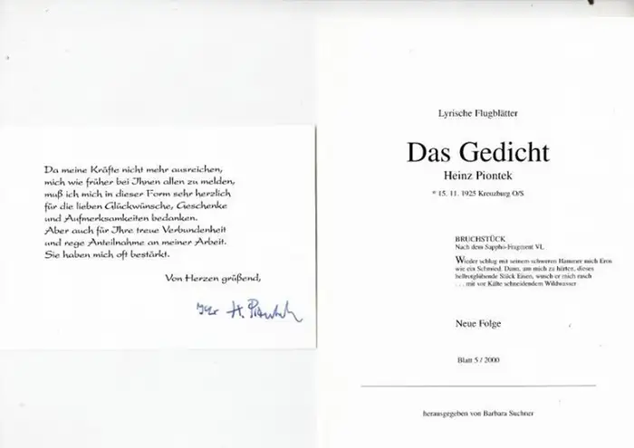 Freie Beschreibung: 21 x 15 cm. Originalheft mit acht Seiten auf festerem Papier, ungebunden. Lose beiliegend in einem nicht frankierten Briefumschlag eine Danksagungskarte für Geburtstagsglückwünsche, von Piontek eigenhändig unterzeichnet und an den Vorbesitzer von "Das Gedicht" gerichtet. Das Ganze in einem frankierten braunem Umschlag, offenbar von Piontek eigenhändig adressiert mit Absender versehen. Gutes Exemplar
