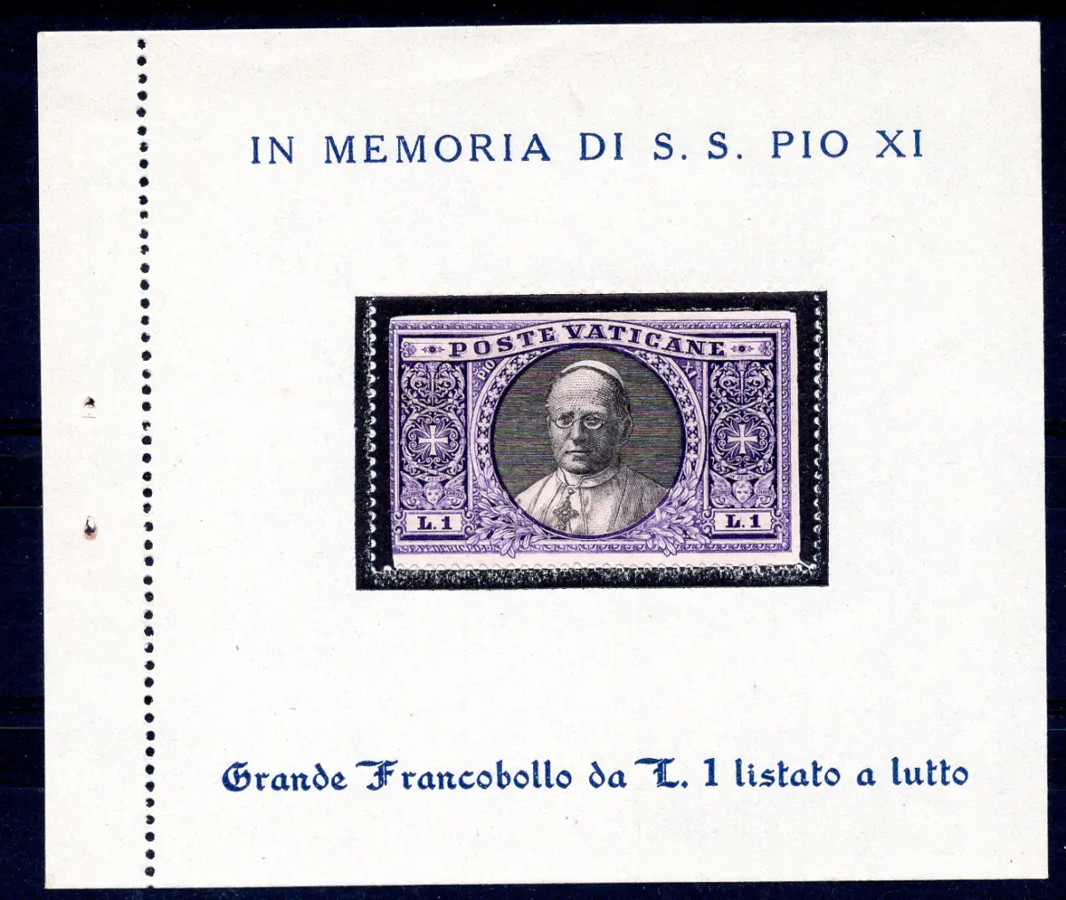 Pius XI. - Gedenkzettel (blau) mit 1-Lira-Briefmarke Trauerliste Pius XI. - Gedenkzettel in Blau bedruckt mit der 1-Lira-Briefmarke in Trauer (Kat. IEC Nr. 1b S. 268) - Ungewöhnlich - Kat. euro 180 Code 704/7