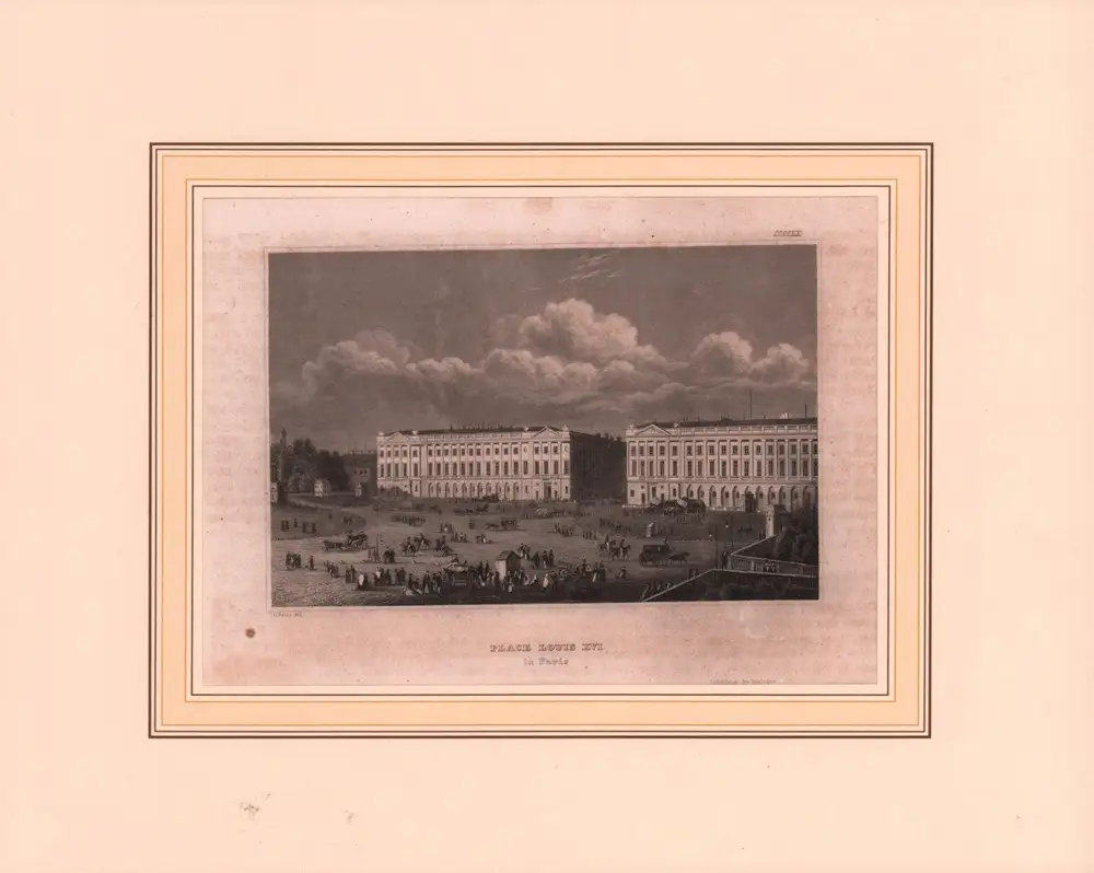 Die Place Louis XVI., seit 1830 Place de la Concorde, ist der größte Platz von Paris u. einer der 5 königlichen Plätze der Stadt, gelegen nördlich der Seine im 8. Arrondissement zwischen dem Jardin des Tuileries u. der Avenue des Champs-Élysées. - Etwas stockfleckig