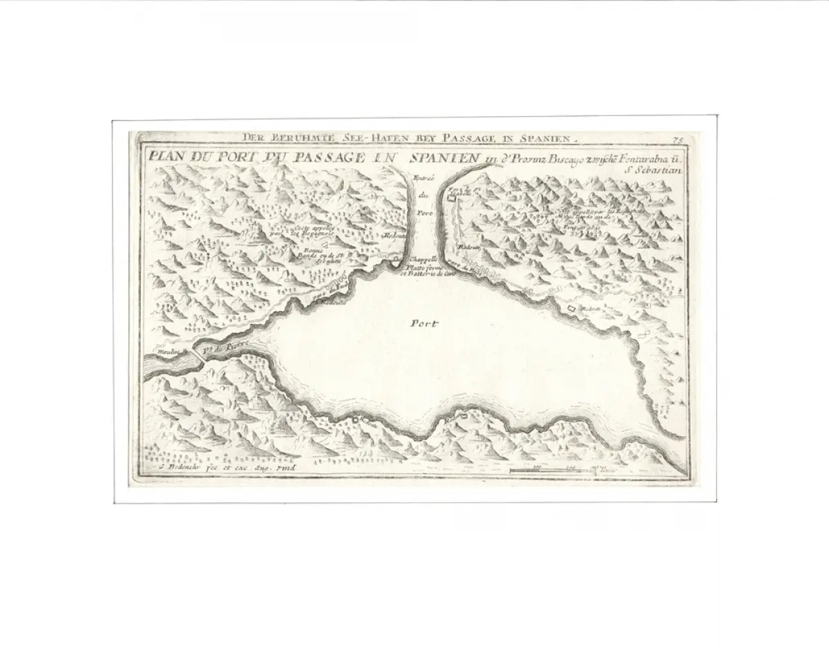 Plan du Port du Passage in Spanien in der Provinz Biscaye zwischen Fontarabia und S. Sebastian. Befestigungsplan aus der Vogelschau. Original-Kupferstich, Bodenehr, Gabriel