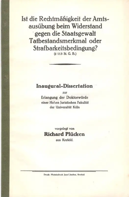 Plücken, Richard: Ist die Rechtmäßigkeit der Amtsausübung beim Widerstand gegen die Staatsgewalt Tatbestandsmerkmal oder Strafbarkeitsbedingung? : (§ 113 St.G.B.). >Dissertation<.