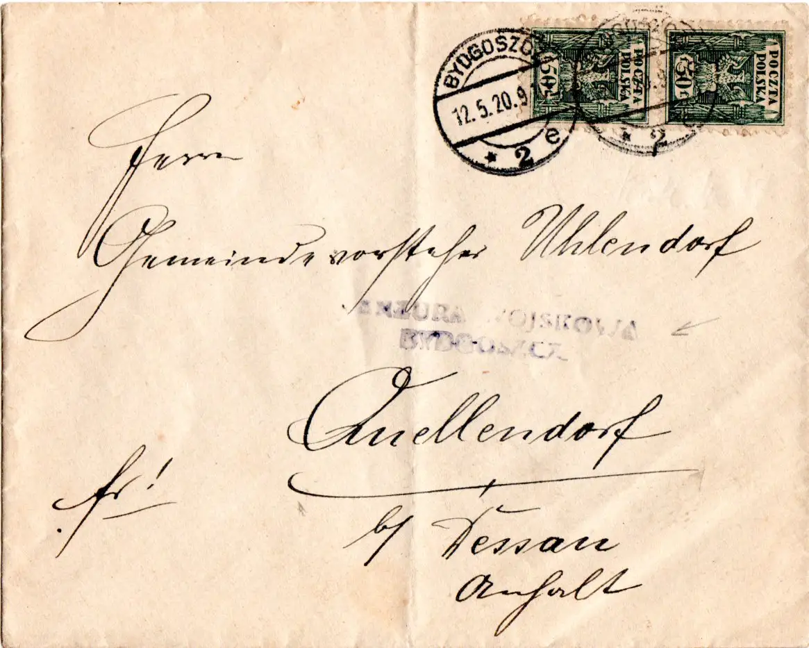 Polen 1920, 2x50 F. auf Brief m. Zensur-L2 Cenzura Wojskowa Bygdoszcz
