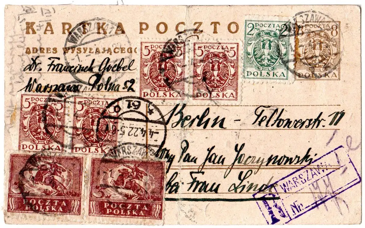 Polen 1922, 7 Marken als Zusatzfrankatur auf eingeschriebener 8 Mk. Ganzsache
