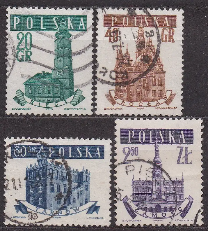 Polen, Mi-Nr. 1046, 1047, 1048 + 1050 gest., Alte Rathäuser