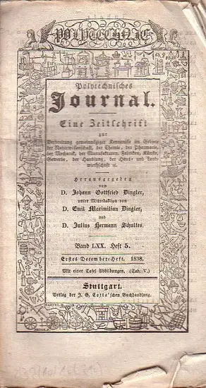 Polytechnisches Journal. Hrsg. v. Johann Gottfried Dingler, Emil Maximilian Dingler und Julius Hermann Schultes: Polytechnisches Journal. Band LXX. Heft 5, Erstes December=Heft 1838. (= 19. Jahrgang, 23. Heft). Eine Zeitschrift zur Verbreitung gemeinn