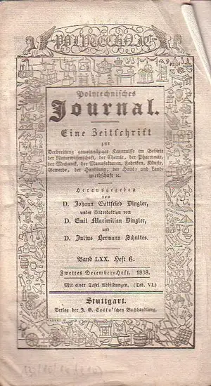 Polytechnisches Journal. Hrsg. v. Johann Gottfried Dingler, Emil Maximilian Dingler und Julius Hermann Schultes: Polytechnisches Journal. Band LXX. Heft 6, Zweites December=Heft 1838. (= 19. Jahrgang, 24. Heft). Eine Zeitschrift zur Verbreitung gemein